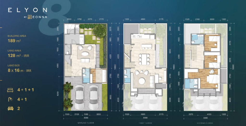 Elyon tipe 8 memiliki luas tanah 128 meter persegi dengan luas bangunan 189 meter persegi. di lantai 1 (lantai dasar kita dapat melihat adanya 2 carport, 1 kamar tidur, ruang tamu dan inner courtyard yang memberikan sirkulasi udara dan pencahayaan yang baik di lantai 1. Lantai 2 terdapat area kitchen, ruang makan, dan ruang keluarga. di Lantai 3 kita dapat menemukan 3 kamar tidur dengan 1 kamar tidur utama yang posisinya disebelah jendela utama facade rumah ini.